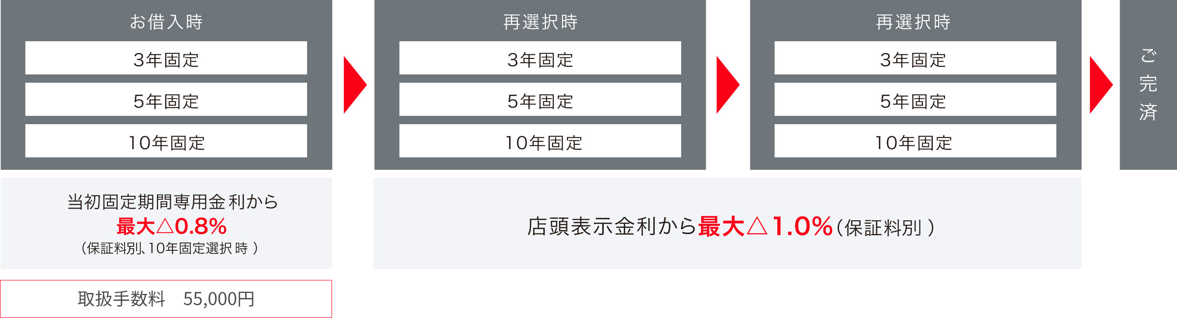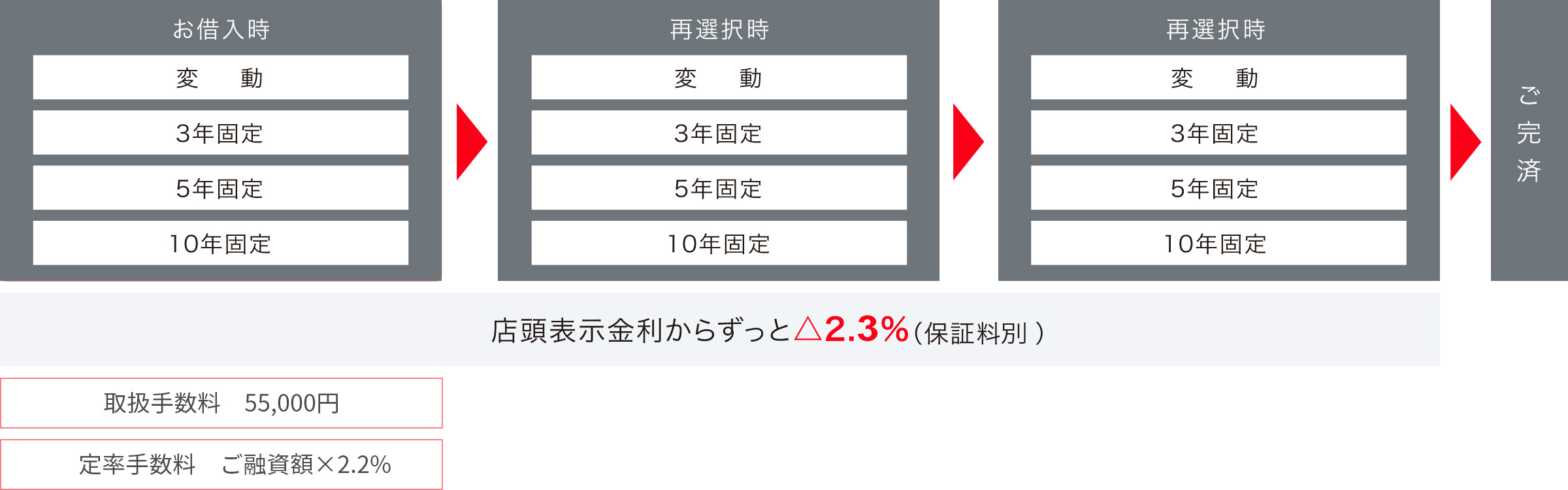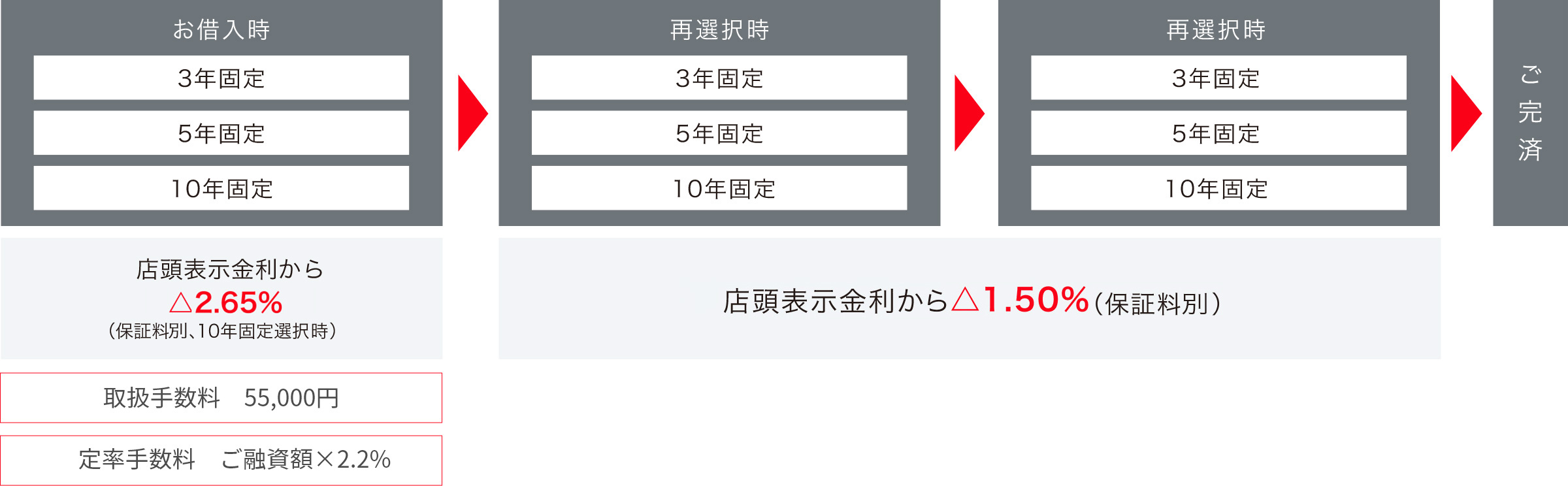 - 「固定金利」をご選択されるつど、11,000円(内 消費税等1,000円)の手数料が必要となります(ただし、お借入れ当初は不要です)。