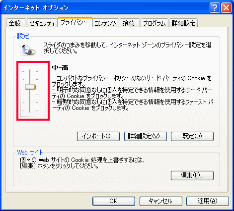 【対策】「インターネットオプション」の「プライバシー」タブを選び「設定」のスライダーでセキュリティーレベルを「中-高」以下に設定します。