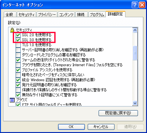 【対策】「インターネットオプション」の「詳細設定」タブを選び「セキュリティ」の「SSL2.0を使用する」、「SSL3.0を使用する」のチェックボックスをONに設定します。