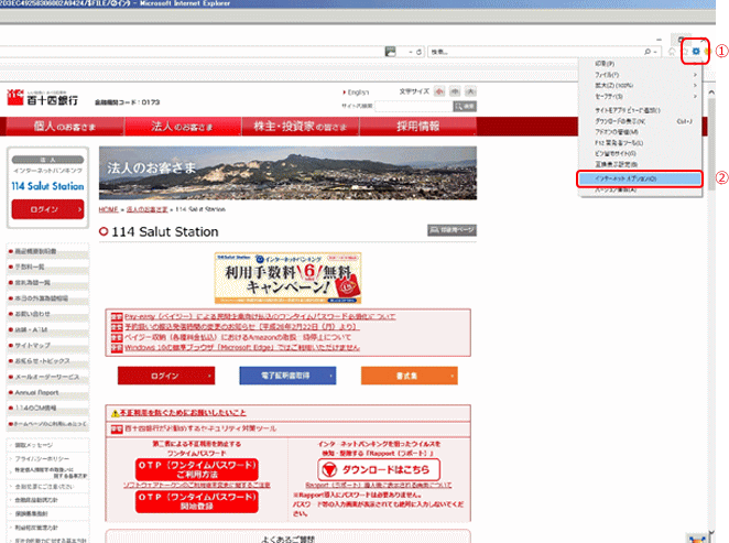 Internet Explorerを開き、①[ツール]アイコンをクリックすると表示されるメニューから②[インターネットオプション(O)]をクリックします。