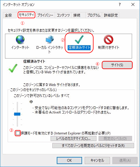 次に③[保護モードを有効にする]のチェックを外し、④[サイト]をクリックします。