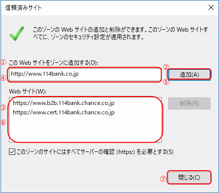 問題なければ再度④[このWebサイトをゾーンに追加する(D)]に「https://www.b2b.114bank.chance.co.jp」を入力した後に⑤[追加]をクリックし、⑥[Webサイト(W)]に入力内容が追加されていることを確認します。