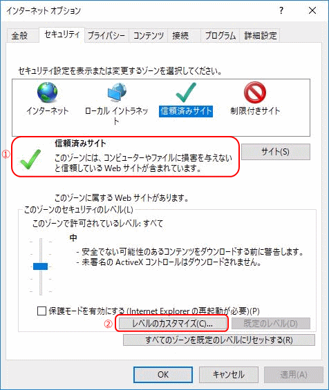 インターネットオプションに戻りましたら、①[信頼済みサイト]が選択された状態のままで②[レベルのカスタマイズ(C)]をクリックします。