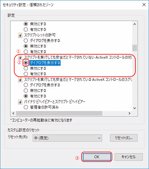 設定の中から①[スクリプトを実行しても安全だとマークされていないActivexコントロールの初期化とスクリプトの実行]を探し、②[ダイアログを表示する]を選択します。