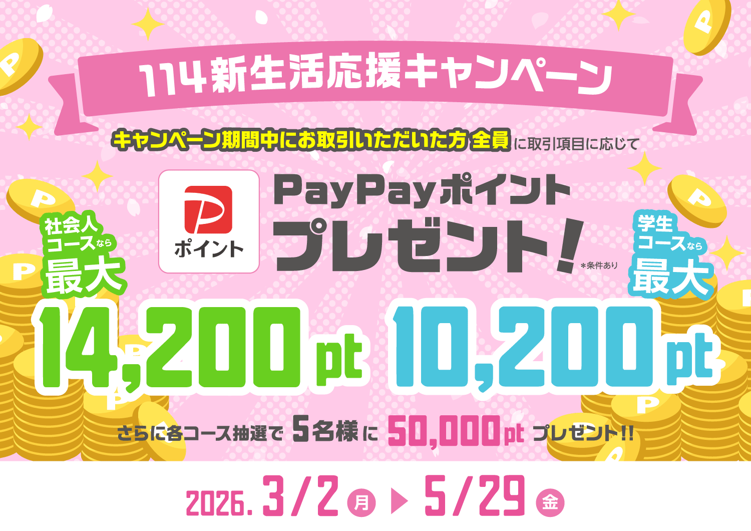 社会人・学生の皆さま、条件を満たすとポイント2倍&抽選で50,000ポイントのチャンス。5月29日まで! -